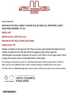 Tickets available on the door for £19. There are also some limited Pay What You Can tickets available for £5. The Town Hall Carriageway Café will be open for refreshments and snacks. Payment via cash or card. This is an all-ages event. There is step-free access and an accessible toilet at the venue.